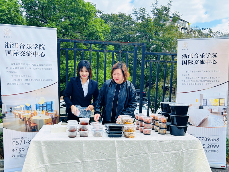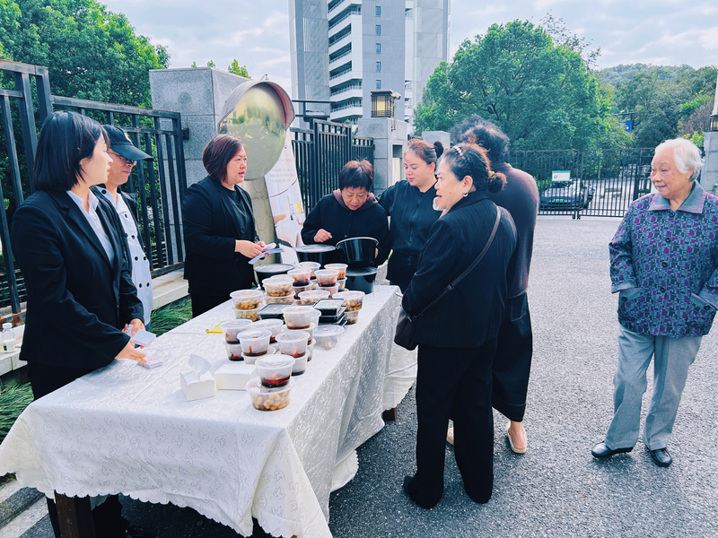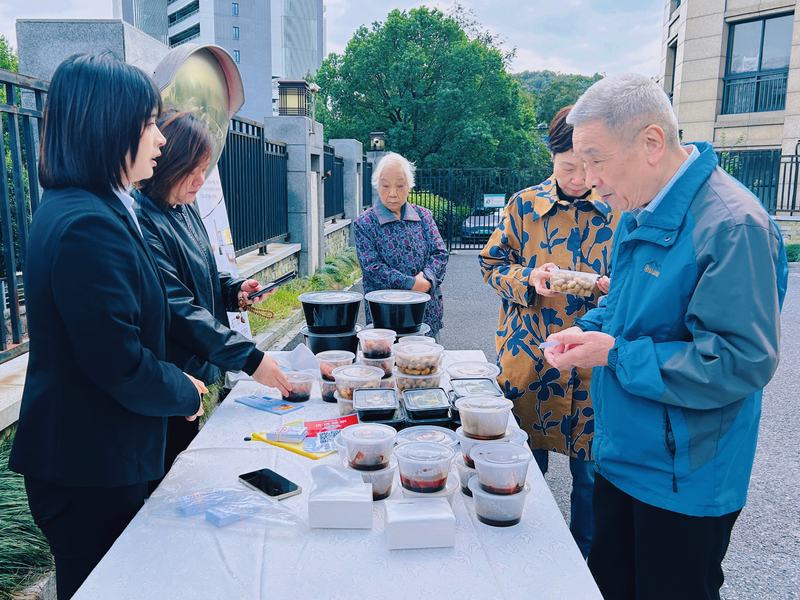 在美食展卖的同时,工作人员积极与居民进行沟通交流,详细介绍了浙音文交的核心业务,并发放优惠体验券。重点推介了国际交流中心酒店的住宿服务,涵盖商务、旅游、考试等多种需求的房型;以及针对亲友聚餐、升学宴、商务宴请等多种定制化餐饮预订服务。不少居民表现出浓厚的兴趣,并纷纷表示:“没想到家门口就有这么专业和高品质的酒店与餐厅,以后一定会亲自去体验。”