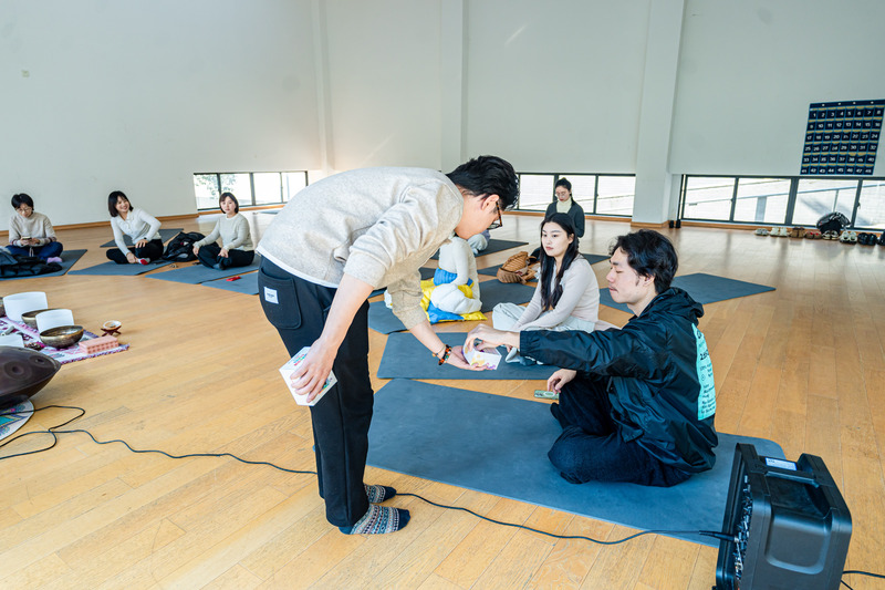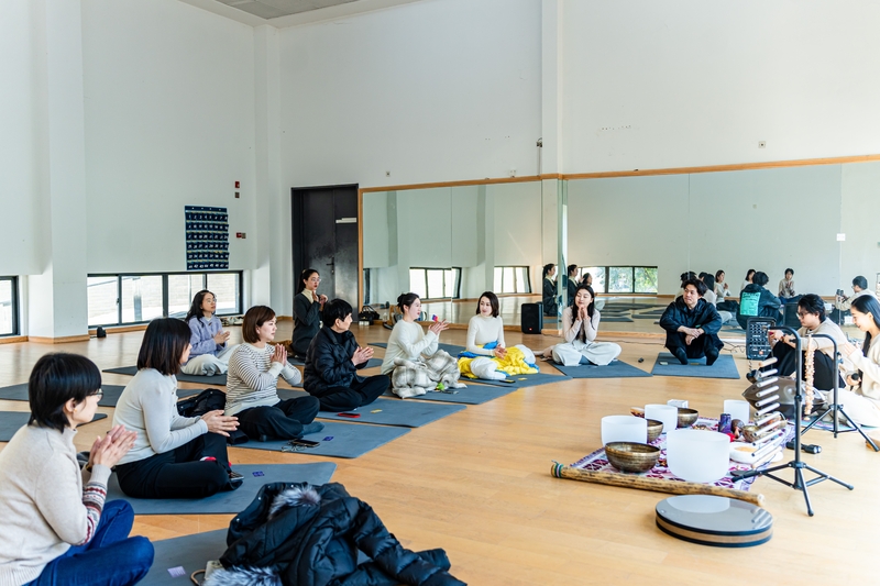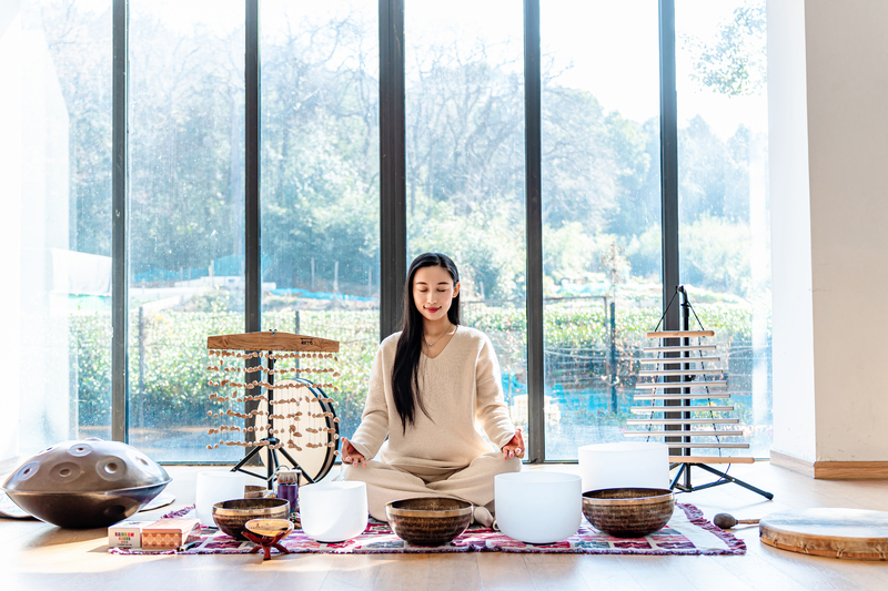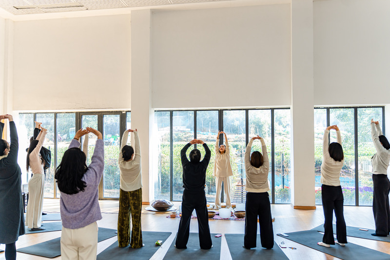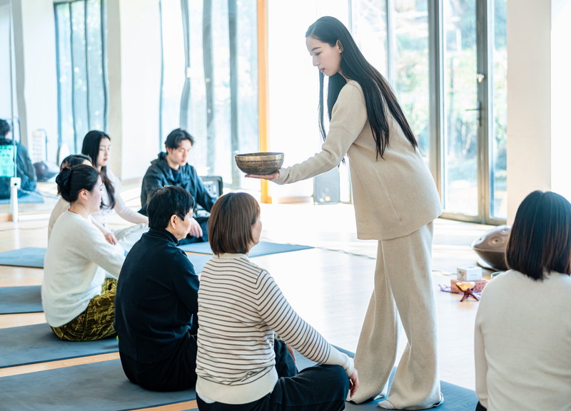 活动以颂钵音疗冥想开篇,参与者闭目静坐、调整呼吸,在声韵中沉淀思绪、舒展身体。随后的身心律动环节氛围转活泼,大家跟随节奏舒展肢体,配合乐器敲击齐声释放情绪,教室内充满敲击声与欢笑声。躺卧放松环节中,参与者平躺于瑜伽垫,在颂钵与海浪声的包裹下彻底放松,不少人悄然入眠,身心得到休憩。