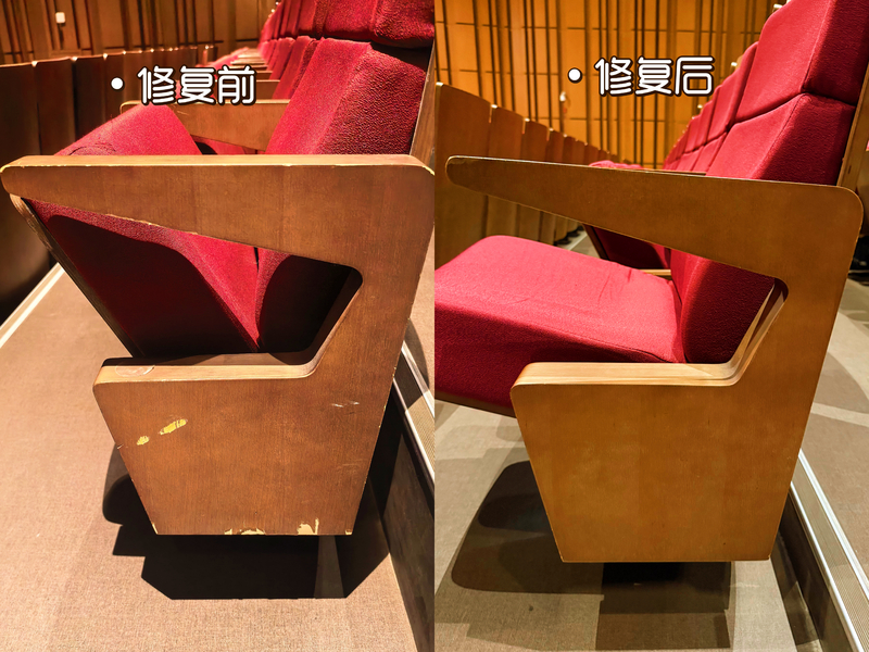 本次修缮严格遵循“修旧如旧、提质增效”的原则,邀请经验丰富的专业技师团队,逐一对每张座椅进行全面排查,结合木饰面材质特性与破损程度,量身定制差异化修缮方案。施工过程严格执行标准化操作,全程精细化把控打磨、修复、上色、防护等每一道工序,确保修复后的木饰面在纹理、色泽上与原饰面高度统一。同时通过专业工艺强化耐磨、防潮性能,有效延长设施使用寿命,实现修复效果与使用品质双提升。
